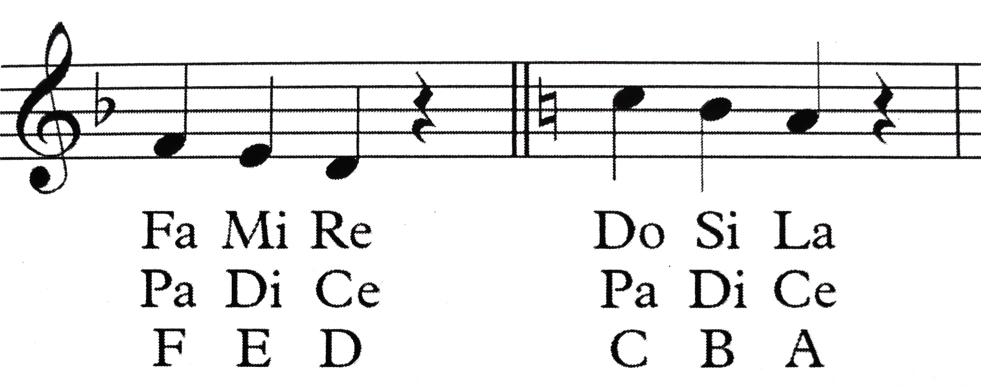 Ejemplo de un pentagrama de simplificado de dos líneas en el que ‘Pa’ es la tónica. Subiendo una tercera mayor encontramos el ‘Be’. Si cantáramos estas notas en Do mayor (C), entonces Do sería el ‘Pa’ & Mi sería el ‘Be’. La melodía escrita se cataría: ‘Mi-Do’ usando los nombres absolutos de las notas en el tono de Do mayor (C). En el segundo pentagrama simplificado vemos cómo las mismas relaciones o distancias se mantienen entre los sonidos: el espacio del medio es ‘Pa’ y subiendo una tercera mayor tenemos al ‘Be’. En este ejemplo tenemos entonces: Pa: Be-Pa en dos posiciones.